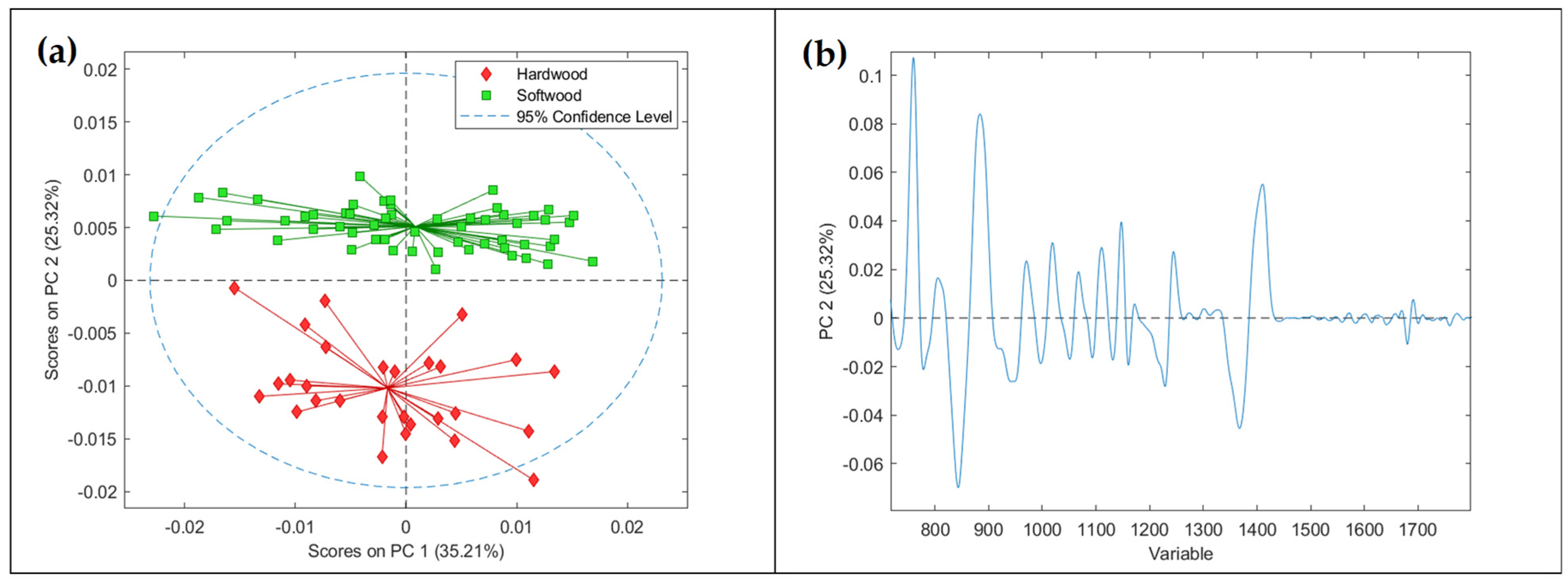 - Chen, H.; Ferrari, C.; Angiuli, M.; Yao, J.; Raspi, C.; Bramanti, E. Qualitative and quantitative analysis of wood samples by Fourier transform infrared spectroscopy and multivariate analysis. Carbohydr. Polym. 2010, 82, 772–778. [Google Scholar] [CrossRef]