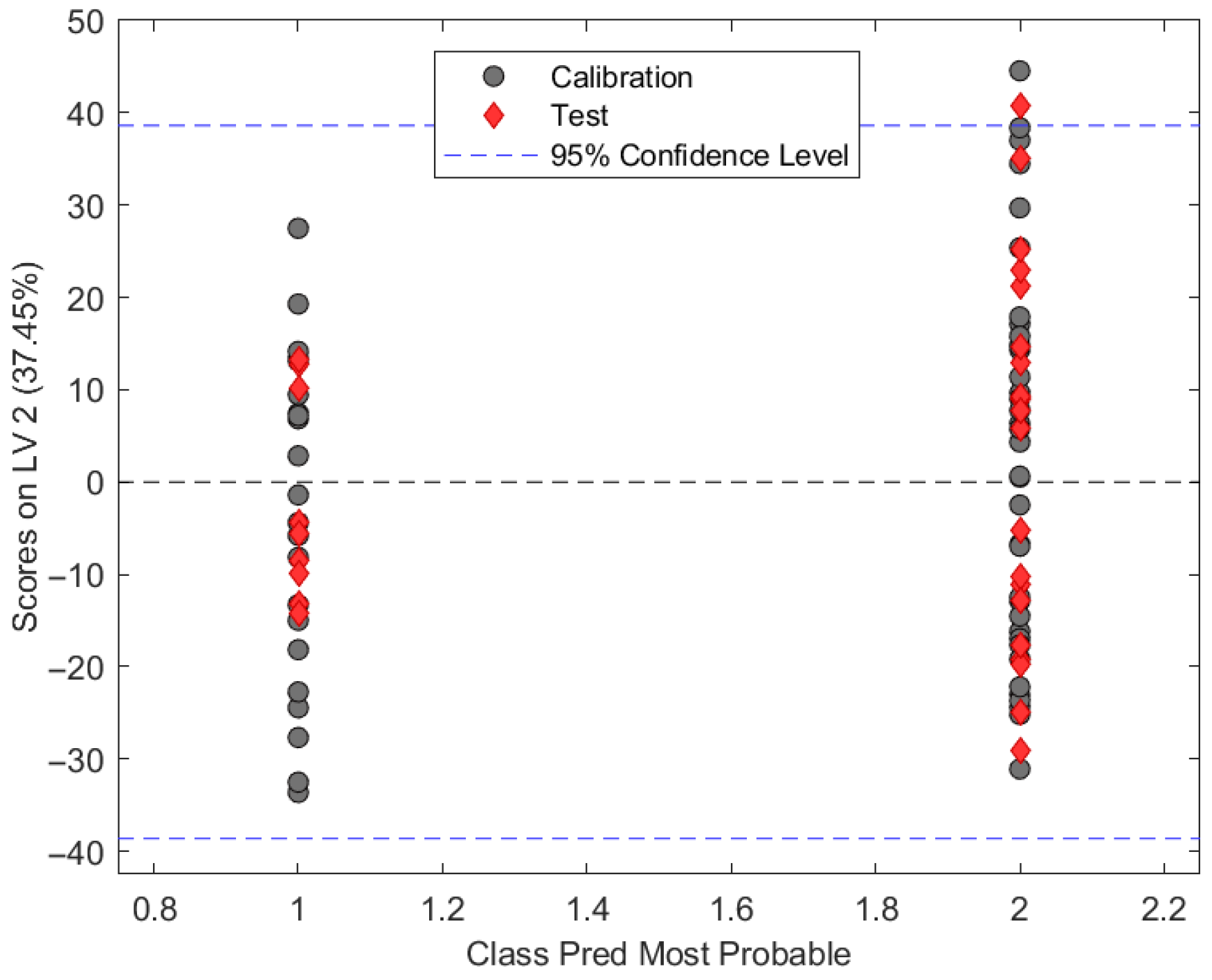 | Data | Cap. Var. % | Modeled Class | Sensitivity (cal)/(pred) | Specificity (cal)/(pred) | Class Error * (cal)/(pred) | RMSEC | RMSECV | RMSEP |