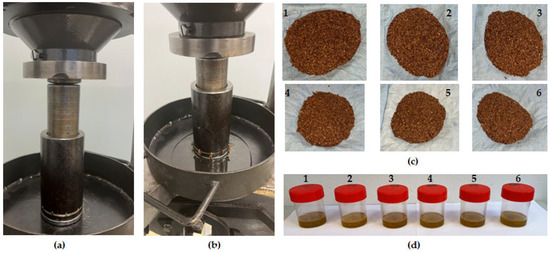 (a): Linear compression process showing the initial pressing height of sample at 60 mm, (b) reduction in intial pressing height of sample to 30 mm for obtaining the pressed oil at 300 kN force and speed of 5 mm/min, (c1–c6) pressed flaxseed samples, and (d) pressed oils at control temperature at 20 °C (1) and heating tmperatures of 40, 45, 50, 55, and 60 °C (2–6).