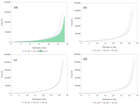 where is the deformation energy (kN·m = kJ), and are the compressive force (kN) and deformation (m), n is the number of data points, and i is the number of sections in which the axis deformation was divided.