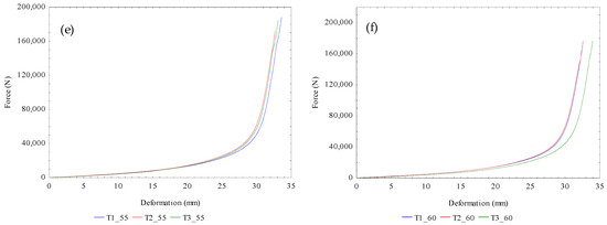 (a–f): Experimental force-deformation curves of bulk flax seeds under control temperature of 20 °C through to 60 °C for three repeated tests (T1–T3).