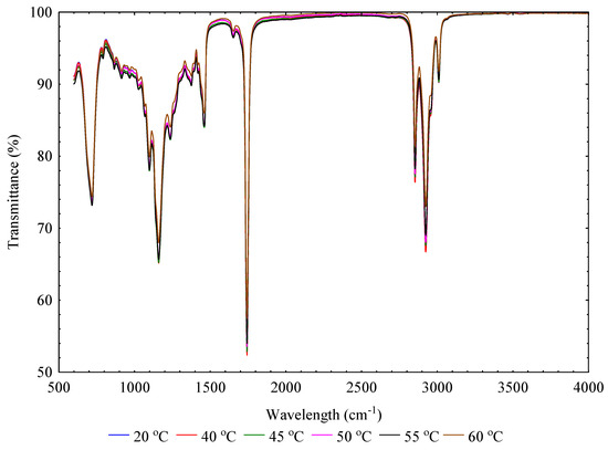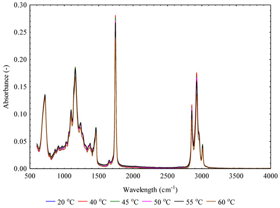 The absorbance and transmittance curves were obtained using ATR-FTIR Alpha II spectroscopy using a zinc-selenide attenuated reflector (Nicolet, Madison, WI, USA). The spectra of the oil samples were recorded by 16 scans at 4 cm−1, and the background spectrum without a sample was recorded every 20 min to remove instrumental and atmospheric contributions to the spectrum of a sample [38,39]. The absorbance spectral curves of the extracted oil samples at the various temperatures were described in the wavelength range between 400 and 4000 cm−1. The measurements were carried out in triplicate, and the results were averaged.