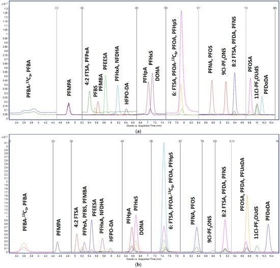 Total ion chromatograms (TICs) acquired in MRM mode showing PFAS separation obtained with different aqueous mobile phases: (a) 0.1% acetic acid and (b) 2 mM ammonium acetate. Y-axis: signal intensity (counts or peak area); X-axis: acquisition time (min).