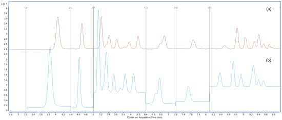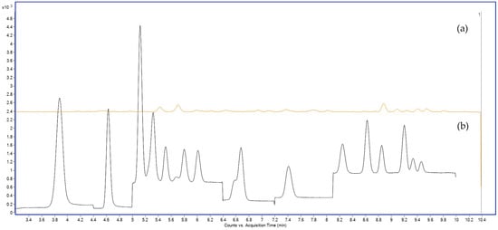 Total ion chromatograms (TICs) acquired in MRM mode showing PFAS separation using 2 mM ammonium acetate in the aqueous phase, (a) methanol, (b) methanol containing 2 mM ammonium acetate as the organic modifier. Y-axis: signal intensity (counts or peak area); X-axis: acquisition time (min).
