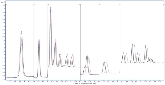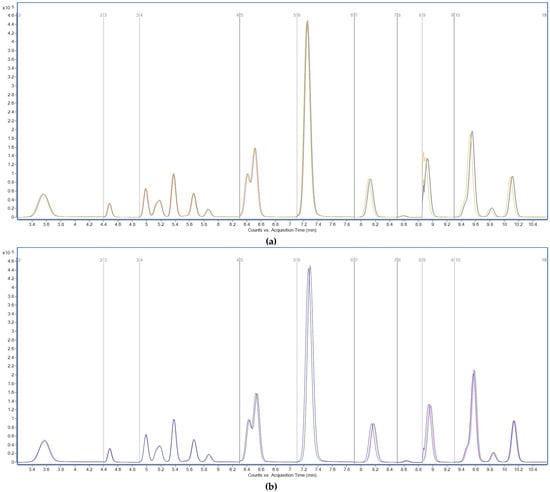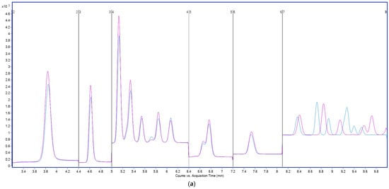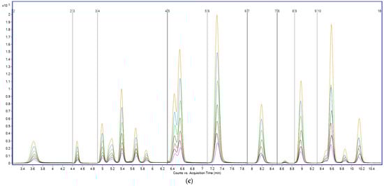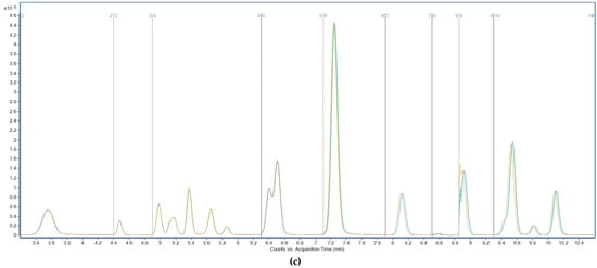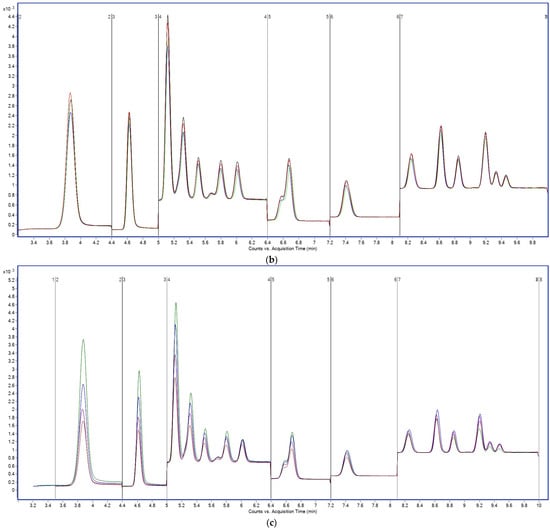 Total ion chromatograms recorded in MRM mode during on robustness assessment. Effect of minor changes in flow rate (a), temperature (b), and injection volume (c) on LC–MS/MS method performance. Y-axis: signal intensity (counts or peak area); X-axis: acquisition time (min).