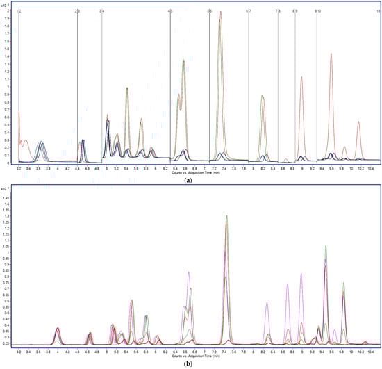 Comparison of chromatographic separation of 28 PFAS obtained using (a) Zorbax Eclipse XDB-C18 column (2.1 × 100 mm, 3.5 µm) and (b) Avantor® ACE® PFAS-dedicated configuration consisting of a PFAS Delay column (10 × 2.1 mm, 2.0 µm) and an HTP-MS analytical column (50 × 2.1 mm, 2.0 µm). Y-axis: signal intensity (counts or peak area); X-axis: acquisition time (min).