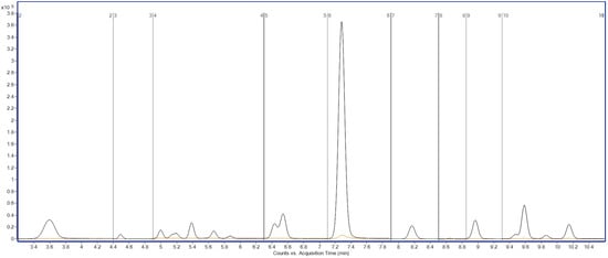 Accuracy was tested by analyzing pre-spiked sewage sludge samples (n = 3) at three concentration levels (e.g., 0.05, 0.25, and 0.5 µg/g) before extraction. The measured concentrations were compared with the nominal spiked values, and the percent accuracy was expressed as the ratio between the determined and theoretical concentrations. Acceptable accuracy was defined as recovery within 80–120% for most analytes, consistent with ICH Q2(R2) and EPA 1633 guidelines [,].