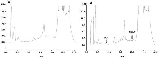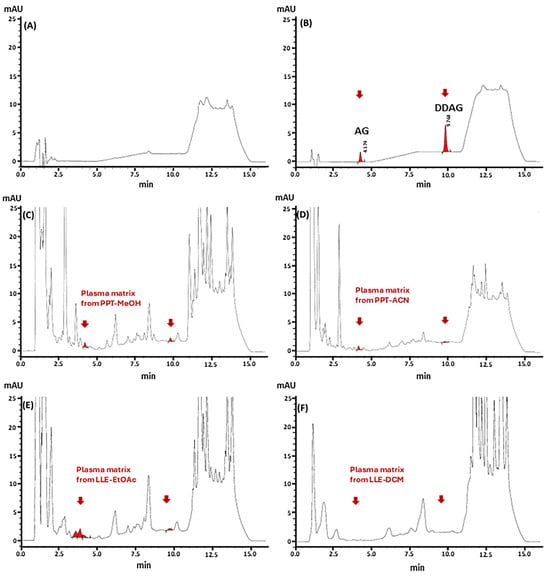 The most straightforward approach to preparing biological fluids for quantitative analysis involves the elimination of proteins. Proteins are generally removed by acidification, thermal treatment, or the use of ultrafiltration membranes with specified molecular weight thresholds. PPT with organic solvents preserves the stability of the analyte [,]. In this study, two different organic solvents, MeOH and ACN, were used in the PPT process. Their effects on the plasma chromatographic background were investigated and the results are shown in Figure 1. The HPLC chromatographic background signals of the blank plasma prepared via the PPT method with both solvents displayed interference peaks with the MeOH preparation (Figure 1c), showing more pronounced interference peaks than the ACN preparation (Figure 1d). This finding aligns with prior research conducted by Chamber et al. (2007) [], which indicated that residual phospholipids, specifically phosphatidylcholines, were found at a concentration 40% higher in samples treated with MeOH than in those treated with ACN. This effect primarily arises from the fact that MeOH is a protic solvent capable of donating hydrogen ions. As a result, MeOH tends to preferentially extract more phospholipids into the solvent phase because of hydrogen bonding with phospholipid head groups [,]. Although MeOH is a widely used and effective solvent for PPT in many studies, its use requires caution. This is because residual phospholipids may interfere with the detection process, leading to the inaccurate quantification of analytes []. In agreement with our study, the interference peaks coincided with the retention times of the target analytes, AG and DDAG, as indicated by the red peaks in Figure 1b–d. Considering the impact of the matrix residue extraction, the PPT method was unsuitable for the chromatographic conditions employed in this study.