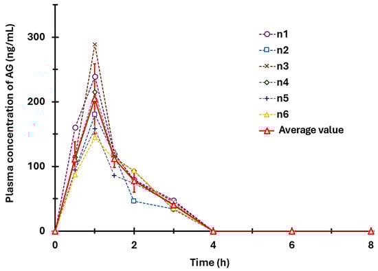 Plasma concentration-time profiles of AG following oral administration of APE at a single dose equivalent to 7.5 mg AG/kg BW in rats. Dashed lines represent individual animal data (n1–n6), while the solid red line indicates the mean concentration with SD (n = 6).