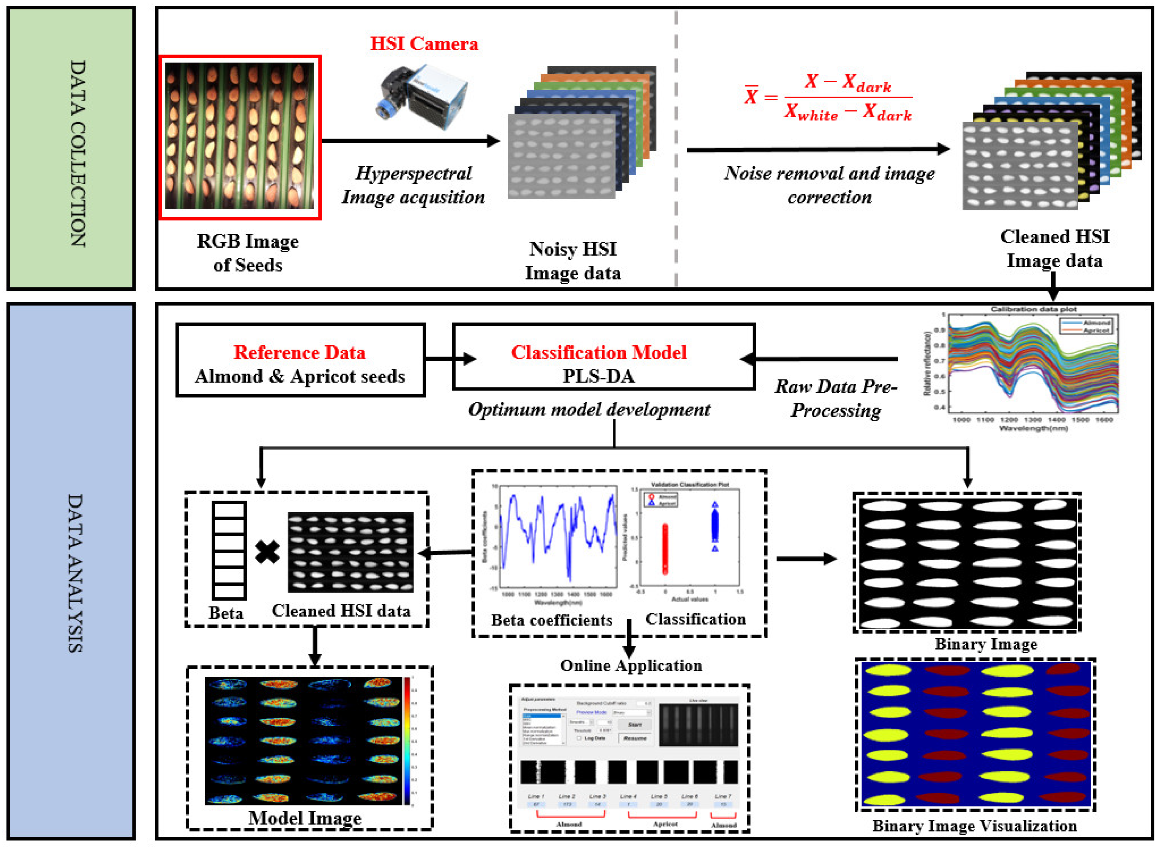 | Pecan | 576 for shelled and 576 for in-shell | Pecan variety identification | 400–1000 and 900–1700 | RF, DT, PLSDA, GB, SVM, and LDA | Acc > 90% | [115] |