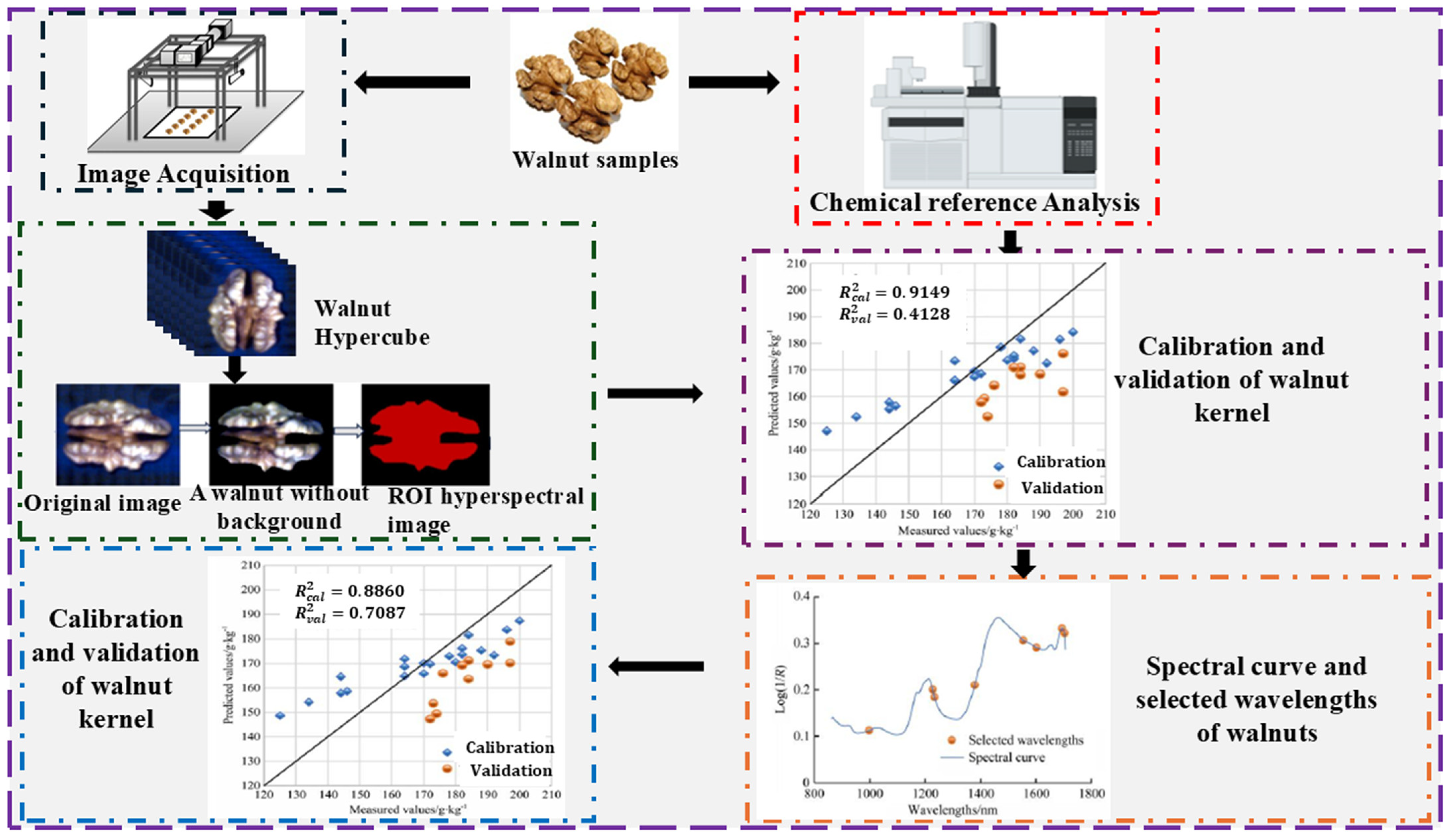 | Walnut | 30 | Assessment of walnut kernel protein content | 863−1704 and 382−1027 | RF | R2 = 0.8537, RMSE = 11.1382 g/kg | [77] |