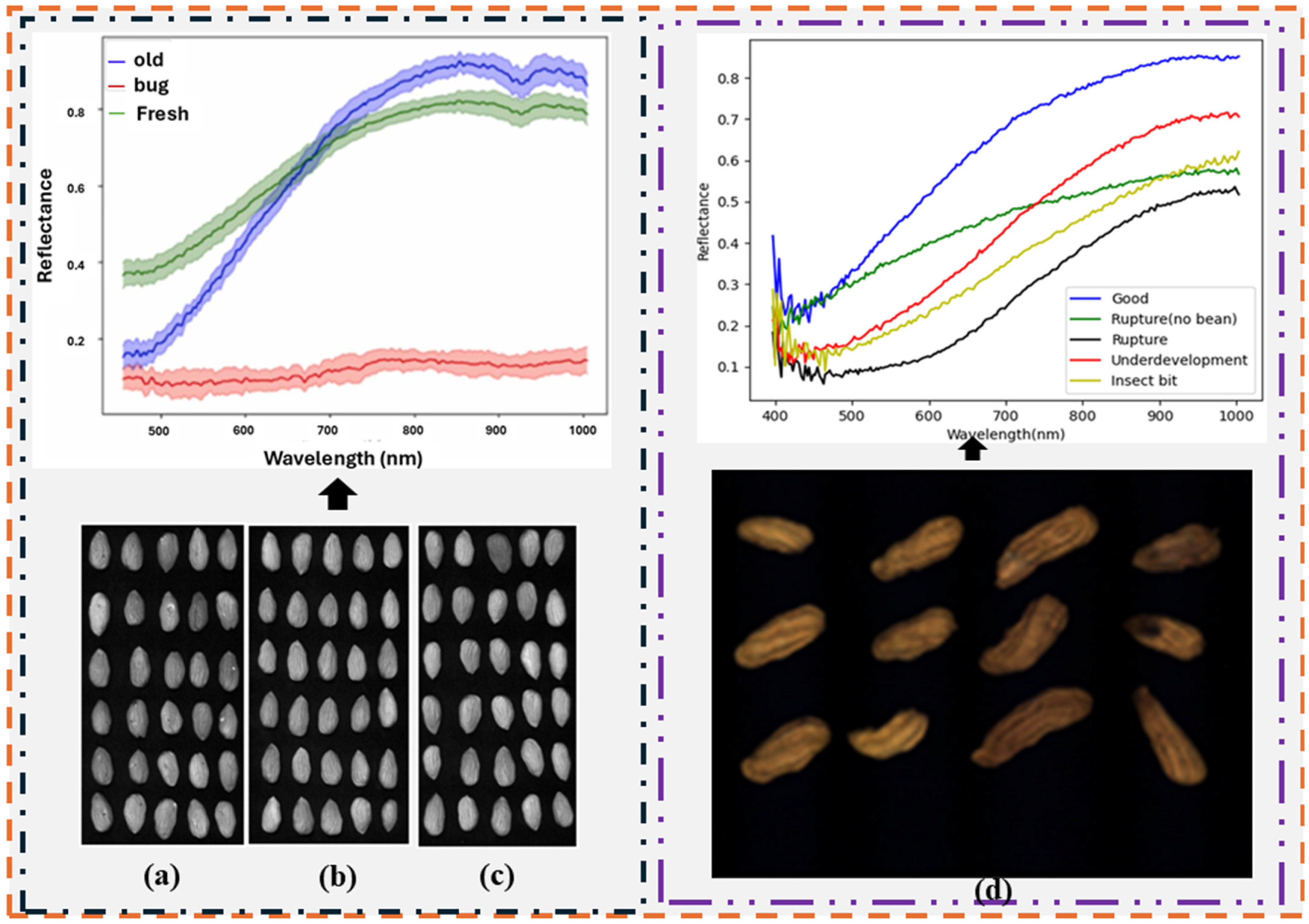 | Mold/Microbial Spoilage | Growth of fungi or bacteria in nuts due to excess moisture or improper storage | Causes off odor, toxicity, and health hazards | Microbiological plating, ELISA, PCR | Spectral differences due to fungal pigments or moisture accumulation | Identifies surface mold or contamination indirectly; highlights hotspots for targeted inspection |
