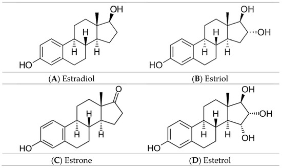 Estrogens are sex hormones, derived from cholesterol, which, in addition to their role in the development and function of female reproductive function, present a protective effect against neurodegenerative diseases, playing a key role in bone metabolism and cardiovascular function [1,2,3,4,5]. In the literature, there are four endogenous estrogens presented: estrone, estradiol, estriol, and estetrol (their chemical structures are illustrated in Figure 1A–D) [6]. The structural differences between the four hormones are reflected by the number of hydroxyl groups. Estradiol presents the most potent hormonal activity, being secreted predominantly during the premenopausal period by the ovaries. Estrone is the second most potent hormone and is mainly produced during menopause by the adipose tissue from dehydroepiandrosterone. The third hormone, estriol, is synthesised during pregnancy by the placenta. Estetrol is the latest endogenous estrogen, discovered in 1965, and it is produced solely by the fetal liver during the pregnancy period [6,7,8,9]. The four endogenous estrogens are currently used in contraceptive therapies for premenopausal women and hormonal replacement therapies [3,8,10].