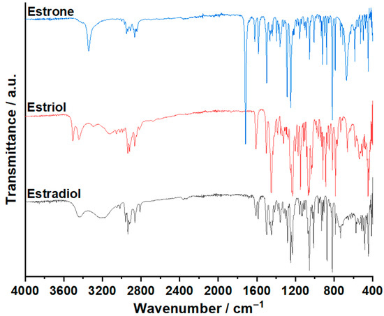 To record the spectra of the three estrogens (estradiol hemihydrate, estriol, and estrone), an IRSpirit Fourier Transform Infrared Spectrophotometer (Shimadzu, Kyoto, Japan) was used. The measurements were performed in the spectral range of 4000 and 400 cm−1, and the spectrum was built after 32 co-added scans at a resolution of 2 cm−1.