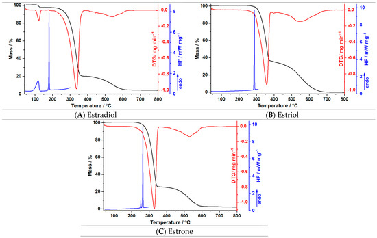 In Figure 3A–C, the thermoanalytical curves TG and DTG are represented, and the data obtained for the selected endogenous estrogens at a heating rate of β = 10 °C min−1 are shown in Table 1.
