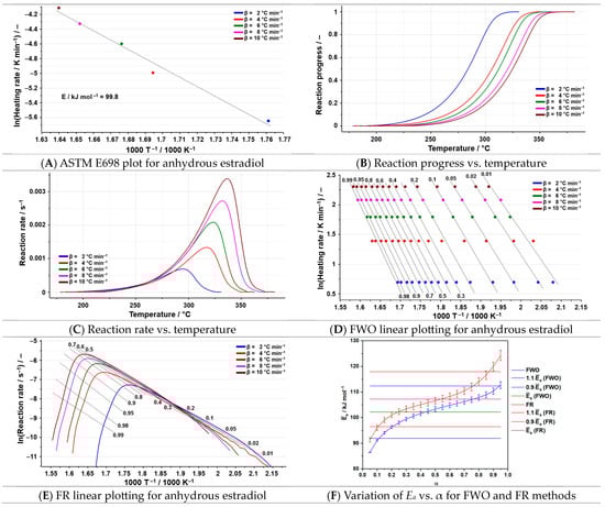 In the case of estradiol, the investigated degradation process is in the temperature range of 179–331 °C at a heating rate of 2 °C min−1, a degradation process characteristic of the anhydrous estradiol. With an increase in the heating rate, the selected degradation process shifts to a higher temperature due to thermal inertia. In Figure 4A–F, the results of the kinetic analysis for the anhydrous estradiol are represented. For estradiol, the obtained value of the activation energy using ASTM E698 is 99.8 kJ mol−1 (Figure 4A). The results of the two isoconversional methods are consistent with the preliminary method (Table 3), the average values of the activation energies obtained being 102.1 kJ mol−1 (FWO) and 107.2 kJ mol−1 (FR).