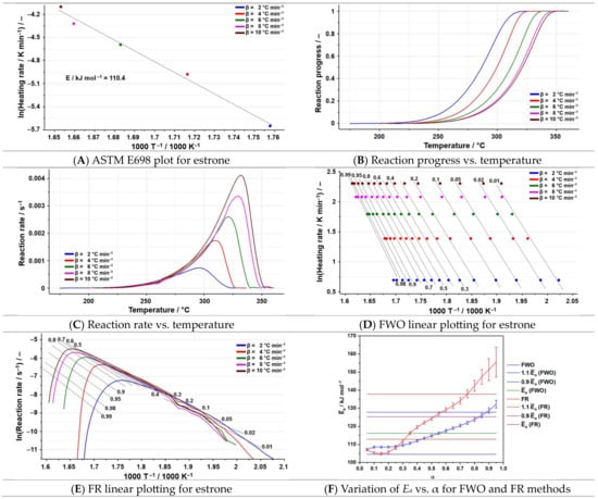 After applying the ASTM E698 kinetic method on estrone (Figure 8A), the Ea obtained is 110.4 kJ mol−1, a value slightly smaller than the ones obtained for the two isoconversional methods (Table 3).