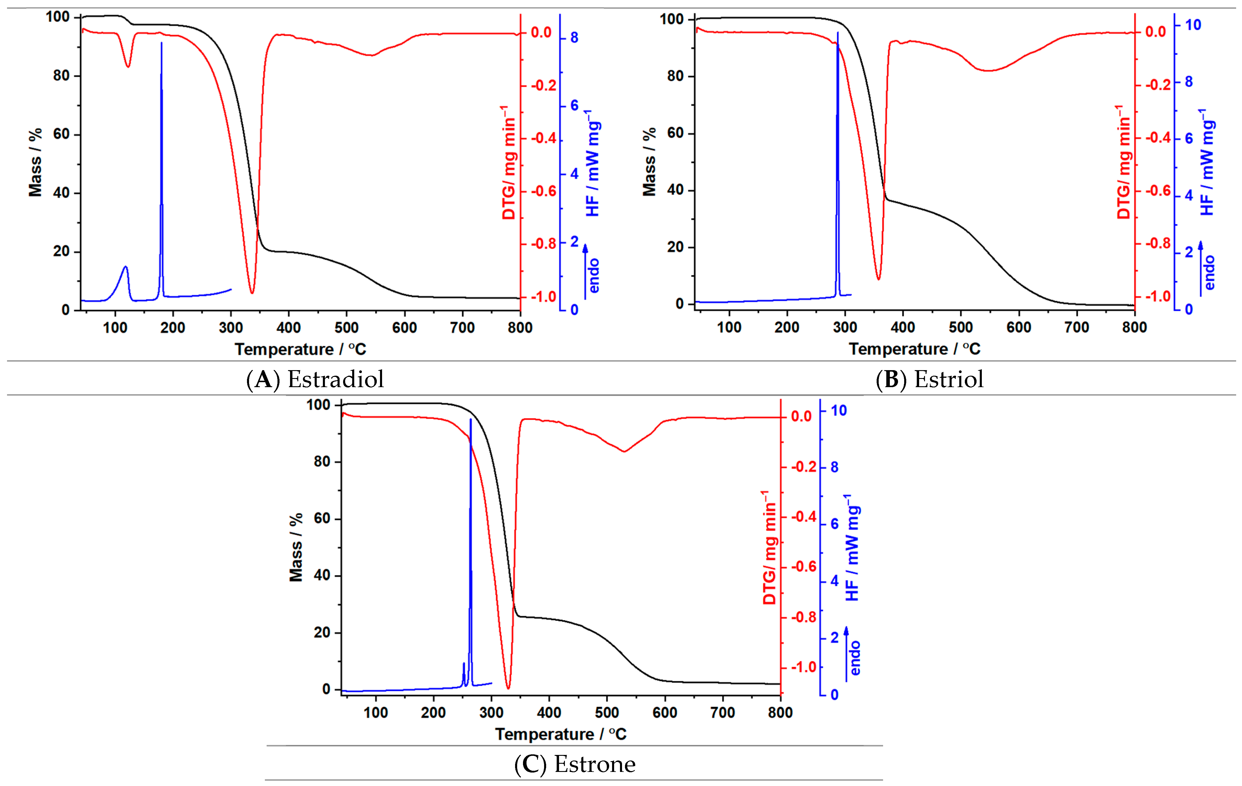 Ridichie, A.; Ledeţi, A.; Bengescu, C.; Sbârcea, L.; Bertici, R.A.; Ivan, D.L.; Vlase, G.; Vlase, T.; Peter, F.; Ledeţi, I. Thermal Stability and Degradation of Three Similar-Structured Endogenous Estrogens. Analytica 2025, 6, 52. https://doi.org/10.3390/analytica6040052