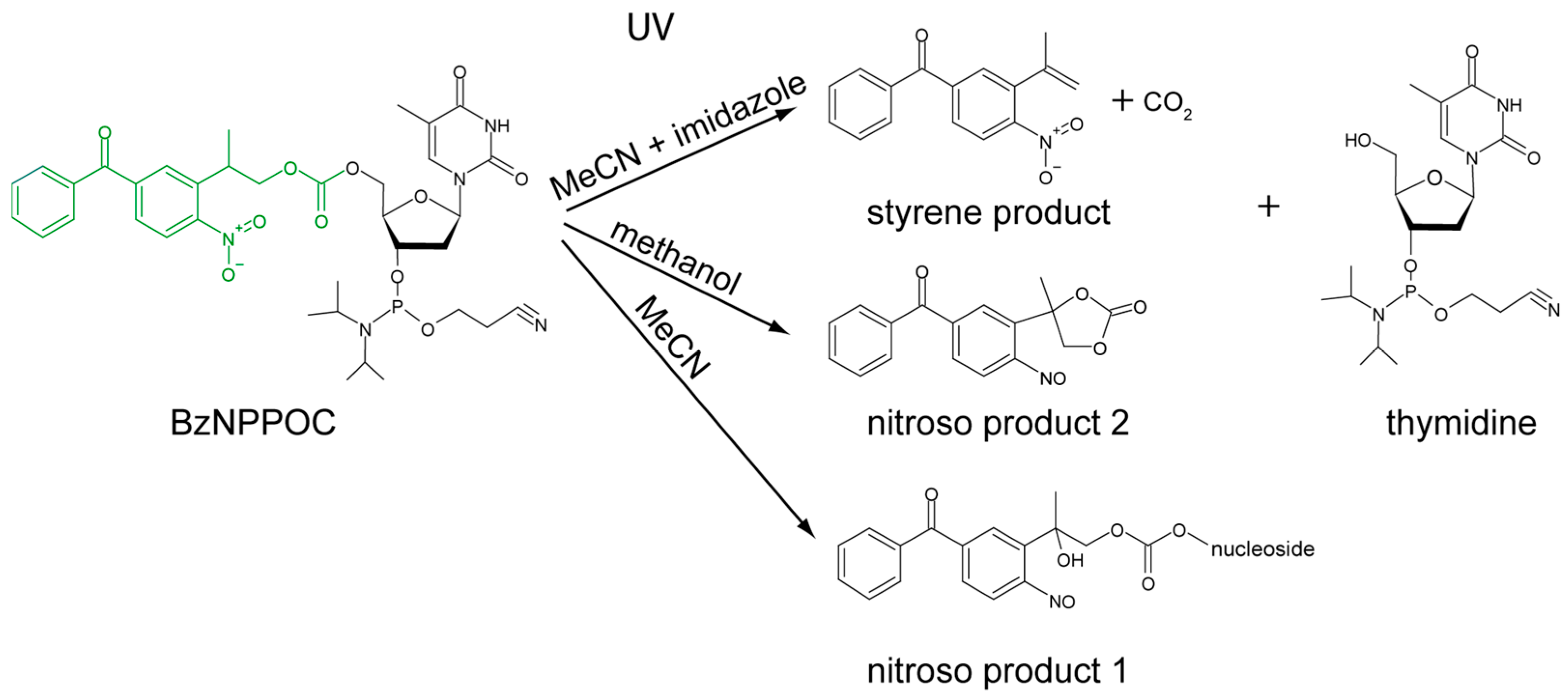 11]. In MeCN, the prevalent pathway is where the aci-nitro form converts to nitroso product 1 without the cleavage of the protecting group or the release of the thymidine. In methanol, nitroso product 1 further transforms to nitroso product 2 with concomitant cleavage of the protecting group and the release of the thymidine. In acetonitrile, with the addition of a small amount of weak base such as imidazole, the reaction follows a different pathway of β-elimination process with the formation of intermediate aci-nitro anion and the final styrene product with the release of nucleoside and carbon dioxide [