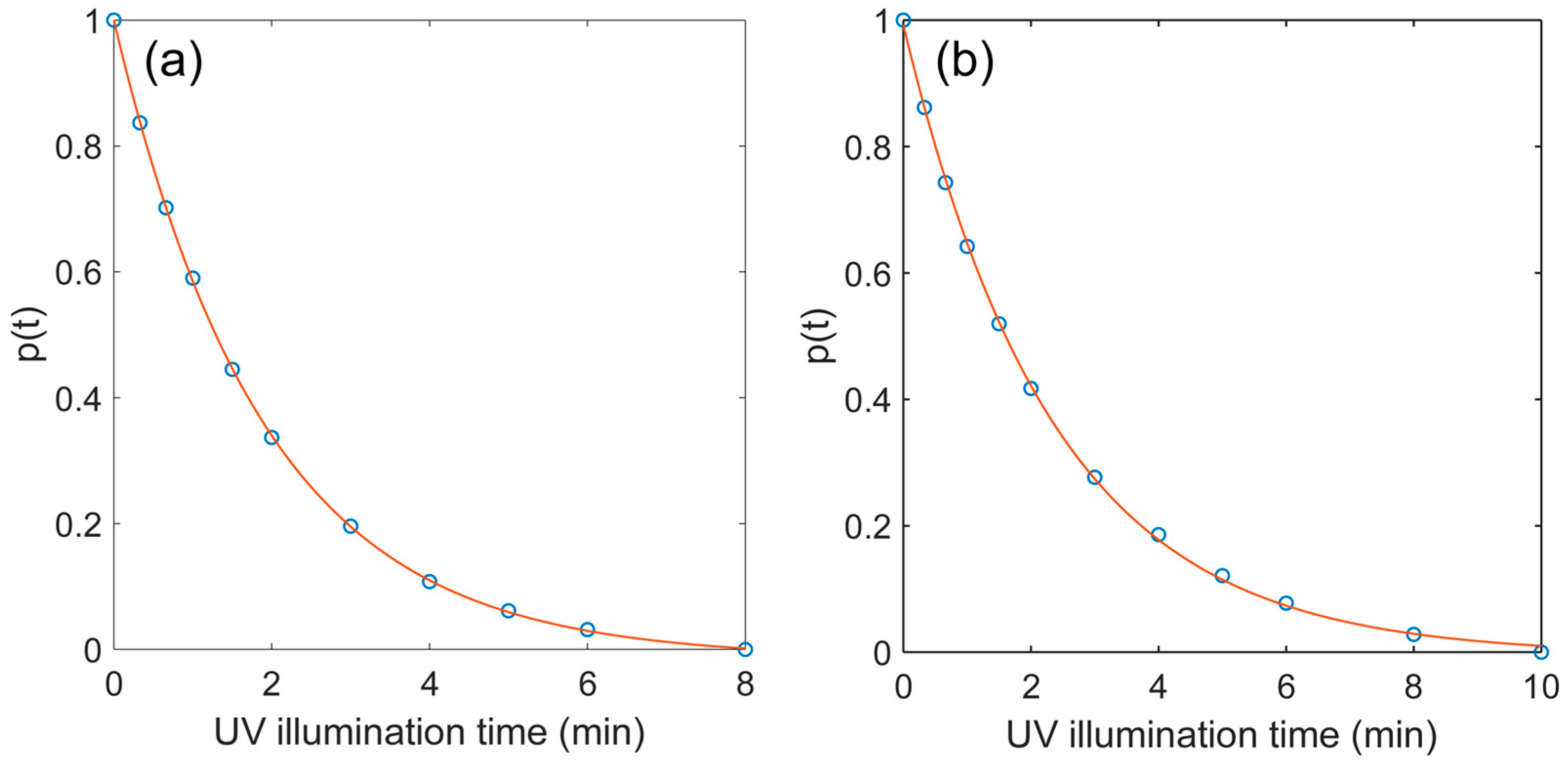 In Equation (17), p(t) is a fitting parameter in the expression of the measured absorbance spectrum as a sum of the first and last measured spectra in the time series. Thus, the obtained p(t) is then fit with a single exponential, Equation (12), to obtain the kinetic rate constant of the deprotection reaction.