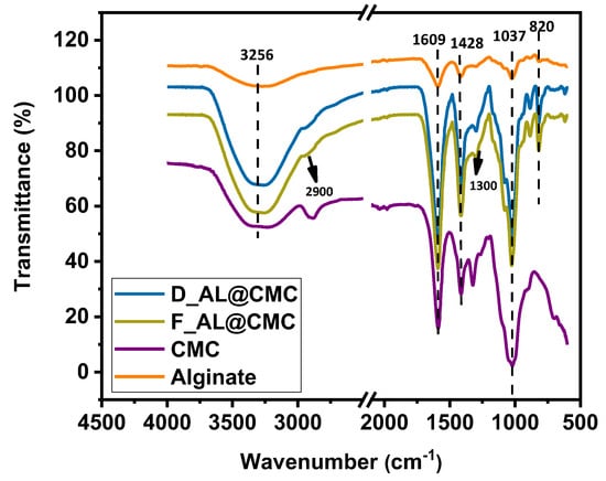 FTIR spectra of Alginate, CMC, D_AL@CMC and F_AL@CMC.