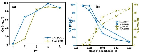 Figure 5b shows the importance of the dosage of adsorbent beads on the adsorption of Cu(II) ions. Dosage directly affects available active adsorption sites on the adsorbents [38]. The results demonstrate that the percentage of removal rate of Cu(II) increased with increasing the dose of both adsorbents [39]. The maximum removal rate of Cu(II) outreached 95.05% and 95.35% for D_AL@CMC and F_AL@CMC, respectively, when the mass of the beads was 0.08 g. However, for D_AL@CMC, the adsorption amount of Cu(II) decreased rapidly with increasing the mass of adsorbents in the range between 0.01 and 0.04 g; after that, the rate got slower from 0.04 to 0.08 g. This behavior is due to the fact that on increasing the adsorbent dose, more adsorption sites are available for interaction with the metal ions. No relevant increase in adsorption efficiency was noticed at higher dosages which may be due to the saturation of the surface binding sites and/or unavailability of adsorbed ions [15]. As for the F_AL@CMC, the rate of adsorption amount got slightly slower after 0.06 g. On the other hand, the particulate interaction, such as aggregation resulting from high adsorbent dosage, contributes to these findings [40]. The equilibrium point of the percentage removal rate and adsorption amount was selected as the optimal mass of the beads. Therefore, the most appropriate amount of adsorbents was 0.03 g.