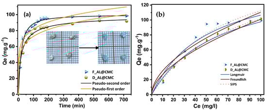 The effect of time on the adsorption properties of copper ions using the prepared beads is shown in Figure 6a. The time range studied was from zero to 720 min for a concentration of 100 mg·L−1 and an adsorbent dosage of 0.03 g. As it is noticed, both adsorbents exhibited close adsorption kinetics of Cu(II). The rate of the adsorption amount kept increasing up to 170 min for D_AL@CMC and 150 min for F_AL@CMC until gradually reaching the equilibrium; This behavior could be explained by the presence of many available sites responsible for the adsorption process groups in the chemical structure of the adsorbents [41]. Furthermore, F_AL@CMC reaches equilibrium earlier than D_AL@CMC, confirming that freeze-drying enhances mass transfer kinetics. The similar equilibrium capacities reflect comparable densities of functional groups, consistent with a chemisorption-controlled process.