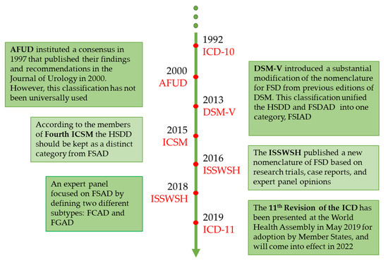 FSD is a heterogeneous group of disorders that can be related to desire, arousal, orgasm, or sexual pain [13]. During the last decades, several definitions and classifications of FSD have been proposed. Figure 1 reports the history of the main classifications of FSD and the main classifications of FSD are described in Table 1.