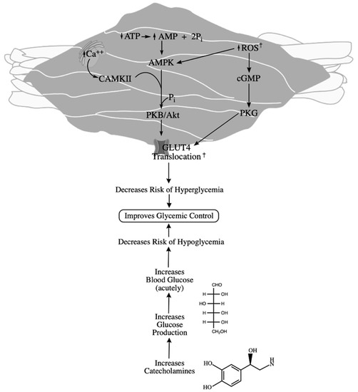Impacts of resistance exercise on glycemic stability. Contraction stimulates calcium release, activating CAMKII, and ATP utilization, activating AMPK. Both of these kinases stimulate PKB/Akt activity, upregulating GLUT translocation. Exercising the skeletal muscle also results in endogenous ROS production, which upregulates GLUT translocation both by AMPK and PKG. Increased glucose uptake by these mechanisms decreases the risk of hyperglycemia. Resistance exercise also decreases the risk of hypoglycemia by increasing catecholamine production, increasing glucose availability. † denotes outcomes exacerbated by BFR according to current literature.