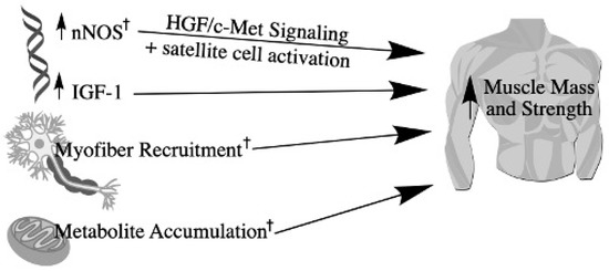 Mechanisms by which resistance exercise and BFR increase muscle mass and strength. BFR-induced hypoxia stimulates nNOS signaling, leading to the production of hepatocyte growth factor (HGF), which binds to the c-Met receptor on satellite cells to activate their proliferation. Myofibrillar protein synthesis also increases following resistance exercise due to increased IGF-1. Muscle strength also increases as a product of hypoxia and venous occlusion from BFR, causing increased metabolite accumulation. This accelerates fatigue, requiring increased myofiber recruitment. † denotes outcomes exacerbated by BFR according to current literature.