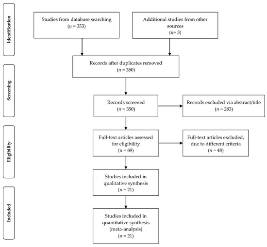 Literature search from the databases yielded 353 citations, of which 3 were duplicates and discarded, resulting in 350 unique citations. Following the first review of the titles and abstracts, 283 articles were excluded for not meeting the inclusion criteria. Further, following a detailed examination of the 69 full-text articles, 48 articles were removed due to misclassification of DN or the unclear statement of the methods used in the study. Consequently, a total of 21 studies were found eligible and were included in the meta-analysis. The PRISMA flow of the review process is shown in Figure 1. These studies consisted of 2783 patients and 673 healthy in total. Table 1 represents the population’s characteristics extracted from each study. Precisely, studies included 1196 patients with T1DM, 1587 patients with T2DM, and 673 healthy individuals. The group of patients with T1DM involved 644 patients (53.8%) with normoalbuminuria, 477 patients with microalbuminuria (39.8%), and 75 patients (6.3%) with macroalbuminuria. The group of patients with T2DM involved 760 patients (47.8%) with normoalbuminuria, 663 patients (41.7%) with microalbuminuria, and 164 patients (10.3%) with macroalbuminuria. Patients with macroalbuminuria were not included in the meta-analysis due to the insufficient number of studies. Furthermore, 50.5% of the patient group, were male with a mean age of 53.4 years old. In the healthy group 50.1% were male with a mean age of 51.3 years old. The clinical features collected from the studies are expressed by the weighted average and the concentrated standard deviation and are presented in supplementary Table S1.
