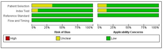 The Quality Assessment of Diagnostic Accuracy Studies–QUADAS. The figure represents the risk of bias and the applicability concern for the included studies. Each risk of bias is illustrated as percentage (%).
