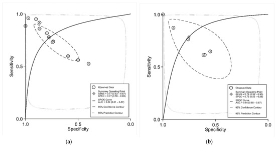 The hierarchical summary Receiver Operating Characteristic (hsROC) curve of uNAG (a) and uNAG/Cr (b) to differentiate controls (healthy individuals) from normoalbuminuric diabetic patients.
