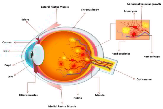Different pathological complications in diabetic retinopathy: Anatomy of complications faced such as retinal vessel hemorrhage and microaneurysms, abnormal vascular development on the retinal surface, and the accumulation of yellowish thick fluids towards the middle of the retina results in edema formation.