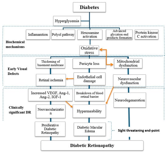 DR arises from hyperglycemia-induced oxidative stress through a series of biochemical mechanisms. As per the microvascular pathology, endothelium damage due to pericyte loss causes hypoperfusion that leads to neovascularization and compromises the integrity of the BRB. These eventually lead to sight-threatening points, which are the major complications of DR. On the other hand, pericytes provide structural support to the capillaries; therefore, the loss of pericytes is also associated with endothelial cell damage, along with cotton wool patches, microaneurysms, and dot and blot hemorrhages. In addition, pericyte loss and damage to the endothelium leads to occlusion of capillaries and local ischemia, which activates hypoxia-inducible factor 1 (HIF-1). Subsequently, activation of this factor further increases the expression of the vascular endothelial growth factor (VEGF). Along with the other angiogenic factors Ang-1 and Ang-2, VEGF induces vascular permeability [38]. At the end stage of pathology, neovascularization and neurodegeneration play a crucial role [37]. Neurodegeneration is a result of hyperglycemia-induced downregulation of several vital neurotrophic factors, including NGF (nerve growth factor), PEDF (pigment epithelium-derived factor), IRBP (interphotoreceptor retinoid-binding protein) and somatostatin, whereas neovascularization involves the upregulation of the pro-angiogenic factors (VEGF, Ang-1, Ang-2), as well as platelet-derived growth factor (PDGF) and vasoactive hepatocyte growth factors [36,38]. Neovascularization generates delicate and permeable blood vessels that are conducive in vitreous hemorrhage. The repetition of such hemorrhages leads to the formation of fibrovascular scars and gliosis, the contraction of which prompts sight-threatening endpoints, namely, PDR and DME [37].