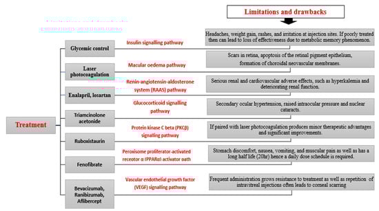 Interventions fall into the three following categories to minimize the risk of vision loss due to DR: the primary prevention of microvascular problems, the early identification of retinopathy, and the effective treatment of existing disease [72]. Blood glucose and blood pressure regulation must be strictly observed to confine the rate and progression of DR [73]. Some randomized controlled studies have shown that blood pressure regulation is an independent risk factor for DR outcomes. According to the EDIC research, each 5 mmHg rise in mean blood pressure (p < 0.001) increased the probability of DR by 11%. Despite the fact that the exact significance of blood pressure regulation in diabetes patients’ optimal ocular outcomes is unclear, strict blood pressure control should be encouraged [74]. Diabetes treatment, guided by blood glucose measurements, reduces the occurrence and development of DR in both type 1 and type 2 diabetes, respectively. The severity of diabetes mellitus (DM) is proportional to the mean glycated hemoglobin index (HbA1c), and strict glucose management provides long-term advantages in delaying or avoiding DM, even when subsequent control is lax [75]. Ophthalmic randomized controlled trials (RCT) validated that blood pressure management and strict glycemic control is a key modifiable factor that can decrease the incidence and development of DR. Pan-retinal laser photocoagulation (PRP), which includes laser burns placed over the whole retina, excluding the central macula, is an established method for treating severe non- proliferative and proliferative DR [76]. In individuals with severe non-proliferative and proliferative retinopathy, pan-retinal laser photocoagulation lowers the probability of moderate and severe vision loss by 50 percent [76,77]. Treatments for clinically prominent diabetic macular edema have been found to be an efficient therapy, utilizing focal or grid laser photocoagulation, as determined by the Early Treatment Diabetic Retinopathy Study group based on clinical fundus examination [78]. There is significant proof that focal laser photocoagulation lowers the risk of mild vision loss by 50% to 70% and increases the possibility of visual improvement [76,77]. Some retinal experts have claimed that vasogenic antagonism might completely replace laser photocoagulation, citing new results. However, because of its long-term advantages, this medication remains a significant element of the DR therapeutic arsenal. Macular photocoagulation is more likely to give similar results to those of peripheral pan-retinal photocoagulation (PRP), i.e., by ablating ischemic retinal tissue to diminish VEGF release from hypoxic sources. Since the pioneering research of ETDRS and the Diabetic Retinopathy Study (DRS), photocoagulation has remained a foundation of DR therapy. These treatments have been related to nyctalopia, presbyopia, and laser scotoma, as well as a decrease in the peripheral field [75]. The flow chart represents some of the current therapeutic techniques of DR along with their limitations and drawbacks are shown below (Figure 3).