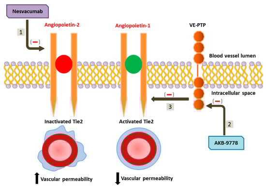 (1) Nesvacumab stimulates Tie-2 signaling and suppresses vascular permeability by inhibiting Ang-2, a Tie-2 antagonist. (2) AKB-9778 stimulates Tie-2 signaling by inhibiting (3) a Tie-2 negative regulator, VE-PTP [10].