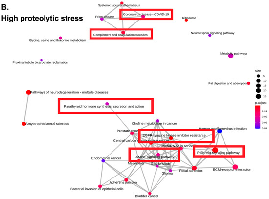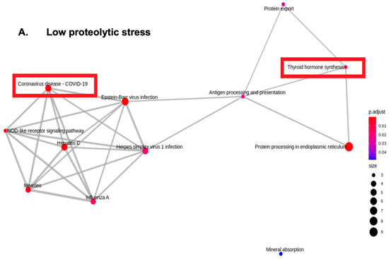GO plots of enrichment analysis Panel (A): COVID-19 pathways are upregulated following proteolytic stress. Transcriptomic profiling data of monocytic THP-1 cells treated with prototypic serine protease trypsin (proteolytic stress) at a low concentration are represented as low proteolytic stress (LPS) compared to control/C in Panel (A). GO plots of enrichment analysis Panel (B): Those treated with trypsin at escalating concentrations are represented as high proteolytic stress (HPS) compared to control/C in Panel (B). The LPS pathway network indicates upregulation of antigen processing and presentation, thyroid hormone synthesis, and COVID-19 pathway upregulation. The interferon response pathway genes were also found to be overexpressed under LPS conditions (data not shown), suggestive of a mild-COVID-19-like disease phenotype. The HPS condition was characterized by upregulation of COVID-19 pathway along with complement–coagulation, metabolic, neurodegenerative, and several bacterial and viral infectious pathways, thus indicating a hyper inflammatory or severe COVID-19-like disease pathway in vitro. HPS was found to result in concomitant upregulation of metabolic stress, which may have implications in pathophysiology of COVID-19 as a plethora of trypsin-like serine proteases including TMPRSS2, furin, DPP4, complement–coagulation serine proteases, neutrophil elastase, and trypsin are upregulated during the inception and course of the disease.