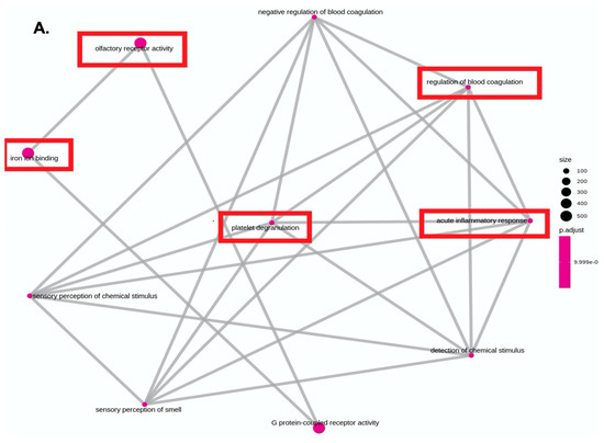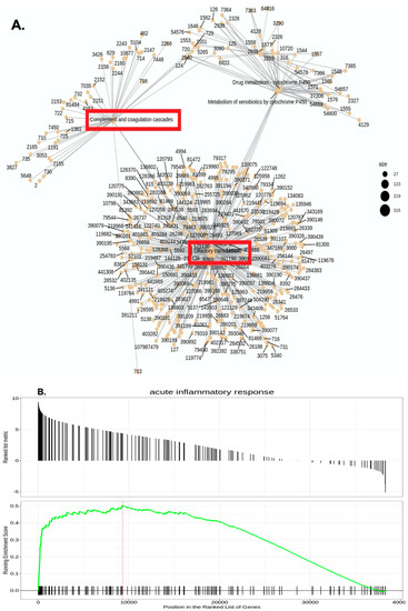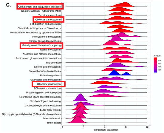Category Net plot: HPS treatment compared to control/C is marked by the upregulation of neurosensory olfactory transduction and complement coagulation pathways Panel (A); GSEA (Gene Set Enrichment Analysis) plot: acute inflammation Panel (B); and ridge plot for GO enrichment pathways: metabolic and maturity-onset diabetes pathways Panel (C). HPS was found to result in concomitant upregulation of metabolic stress, which may have implications in pathophysiology of COVID-19 because trypsin-like serine protease TMPRSS2 is upregulated in olfactory epithelium following SARS-CoV-2. This can induce metabolic stress, olfactory dysregulation (anosmia), and hyperinflammation.