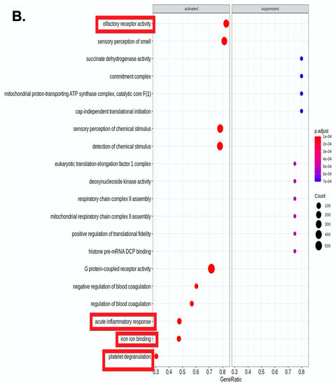 GO plot of enrichment analysis: HPS treatment compared to control/C is marked by upregulation of iron-ion binding Panel (A); dot plot for GO enrichment pathways: deregulation of neurosensory, acute inflammatory, and metabolic (diabetes) pathways Panel (B). This may have implications in pathophysiology of COVID-19-associated new onset diabetes and COVID-19-associated mucormycosis (CAM) because iron is an important nutrient for mucor growth and virulence.