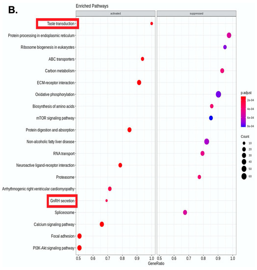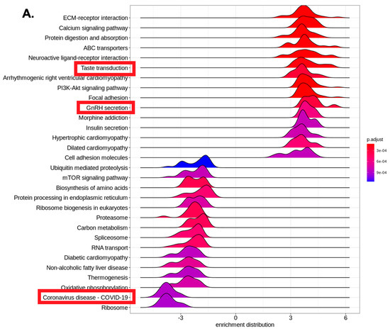 Ridge plot for GO enrichment pathways Panel (A): HPSGFC treatment is a unique condition that combines high proteolytic stress and growth factor levels and cytokine effects (for details, refer to the methodology section). Dot plot for GO enrichment pathways Panel (B): HPSGFC treatment compared to control/C is marked by the upregulation of neuroactive ligand receptor interaction pathways: the neurosensory (olfaction and taste), neuroendocrine (GnRH), and metabolic rebalancing (insulin secretion) pathways Panels (A) and (B): This treatment group resulted in downregulation of the COVID-19 pathway and associated carbon metabolism, spliceosome, oxidative phosphorylation, and RNA transport pathways. This has implications for COVID-19 and CAM because selective growth factor and cytokine responsiveness can help control COVID-19 severity, rescue metabolic health, and ameliorate neurosensory regeneration. The reversal of diabetes (insulin secretion) was linked to the downregulation of the COVID-19 pathway in our in vitro disease modelling. A regulated IL-1 beta/inflammasome activation pathway can have beneficial effects in controlling COVID-19.