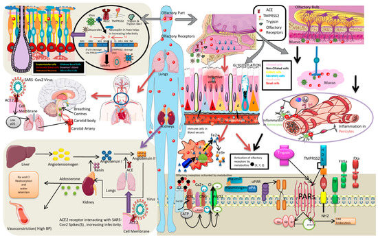 Serine proteases can have cell-autonomous functions (besides SARS-CoV-2 activation) in olfactory microenvironment, in which they can activate and signal through cognate GPCR family of protease-activated receptors (PARs) that participate in transducing downstream inflammatory and calcium signaling pathways, resulting in the regulation of ion channels and transporters. In diabetic patients, endotheliopathy in the vascular olfactory niche can further add to the PAR-transducing protease repertoire by offering pre-activated TF-FVIIa and FXa serine proteases that could have Janus faces during inflammatory propagation. TF-FVIIa and FXa can activate PAR signaling concomitant to the complement coagulation pathway intensification that is central player in COVID-19 pathogenesis [235], and the resultant inflammatory loops can have pro-fibrogenic functions as the associated plasmin and uPAR–uPA signaling modulators are known to have growth factor-binding, TGF-beta-activating, integrin-signaling, and ECM-remodeling features. We report that protease stress is associated with concomitant metabolic deregulation and the differential expression of olfactory transduction pathway genes including the olfactory/odorant receptors (ORs). Importantly, the majority of the olfactory receptors are orphan receptors, and deorphanization is as a major challenge. Many fatty acid and lipid metabolites are potential activating and inhibitory ligands of ORs, and emerging studies have suggesting a broader expression pattern of ORs beyond the olfactory epithelium, including adipocytes, airways, kidneys, livers, lungs, and adipocytes. Extra-nasal ORs have been reported to perform seminal functions including blood pressure regulation via the renin–angiotensin–aldosterone pathway in kidneys and the hypoxia-sensing ORs in the glomus cells of the carotid body. Hypoxia metabolite lactate is a partial agonist of carotid body ORs. Hepatic ORs regulate hepatic lipid accumulation via the regulation of GLP-1, resulting in glucose and insulin tolerance. Airway smooth muscle cells express ORs that regulate bronchoconstriction through calcium signaling via the cAMP pathway. However, ligand-dependent contractility effects that are linked to inflammatory pathways of IL-8 and GMCSF have also been reported. The adipocytic effects of ORs are mediated by hepatic fatty acid oxidation and brown adipose tissue thermogenesis. Epicardial adipose tissue and diabetes mellitus patient plasma contain medium chain fatty acids that can activate cardiac muscle cells and regulate ionotropic effects [236,237]. The appreciable overlap of ORs expression pattern with affected organs in COVID-19 and the OR regulation of RAAS and hypoxia functions led us to propose their potential contribution in disease pathology and their use as therapeutic targets for diabetes, COVID-19 pathology, and CAM.