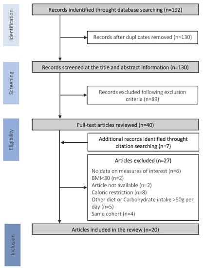 Clear inclusion and exclusion criteria were used to determinate the eligibility of studies. Studies included were full text English or French original articles, using KD for patients with obesity (BMI > 30). We defined “Ketogenic Diet” as a diet with a maximal carbohydrate intake of 50 g per day (corresponding to 10% of daily caloric supply) and no predetermined limit on the caloric intake amount. We used “Ketogenic Diet” and “Low carb diet” as keywords to avoid missing studies due to the utilization of different terms.