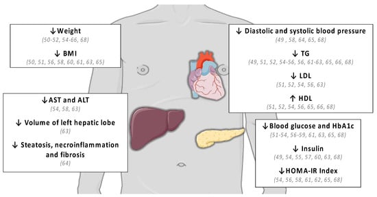In comparison to other parameters, few studies focused on beneficial effects of KD on liver. Three of them showed a decreased of AST and ALT levels [54,58,63], one showed no effect on AST [64], and two reported no changes in ALT levels (Table 3) [64,65].