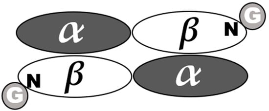 The schematical representation of HbA1c. Glucose residues (G) are attached to N-terminal Val of β-chains. In HbA1c, α-chains are non-glycated.