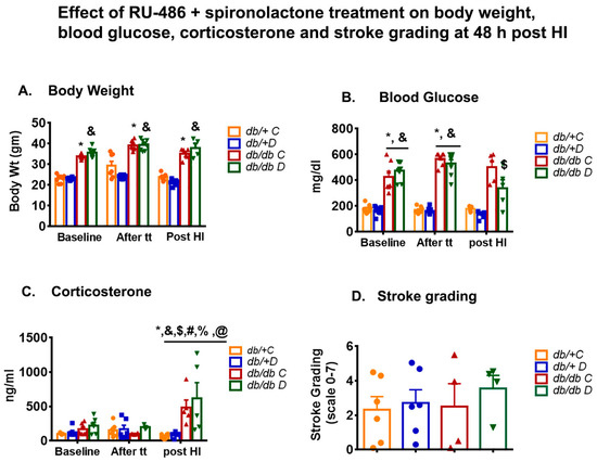(A–C) shows the effect of RU-486 + spironolactone treatment on body weight, blood glucose and corticosterone at baseline, one week after treatment (tt) and 48 h post-HI compared with their vehicle control. Values were shown as mean ± SEM and significance were set at p < 0.05. db/+C: vehicle control (n = 5 to 8), db/+D: RU-486 + spironolactone treatment (n = 5 to 8), db/db C: vehicle control (n = 5 to 8), db/db D: RU-486 + spironolactone treatment (n = 3 to 8), db/db C-tt: after 1week vehicle treatment, db/db D-tt: after 1 week of drug treatment. * p < 0.05 vs. db/+C baseline: and & p < 0.05 vs. db/+D baseline, # p < 0.05 vs. db/db C baseline: $ p < 0.05 vs. db/db D baseline, % p < 0.05 vs. db/db C -tt: @ p < 0.05 vs. db/db D-tt. (D) shows the effect of RU-486 + spironolactone treatment on infarct size (stroke grading), at 48 h post-HI compared with their vehicle control. Values were not significant.