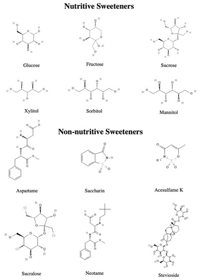 Nutritive and non-nutritive sweeteners chemical structures (Taken from: https://pubchem.ncbi.nlm.nih.gov/, accessed on 23 August 2022).