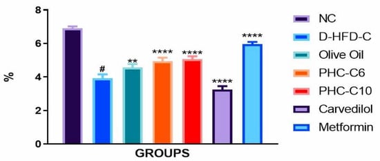 Total collagen content concentrations were highly significantly (# p < 0.0001) increased in STZ + HFD challenged rats (D-HFD-C) when compared with normal control rats. The olive oil treatment group showed a significant decrease (**** p < 0.0001) in collagen content, whereas the polyherbal combination treated groups (PHC6 and PHC10) and those treated with the standards carvedilol (2 mg/kg) or metformin (70 mg/kg) showed only a significant reduction (**p < 0.01) in cardiac collagen content. The results are shown in Figure 6.