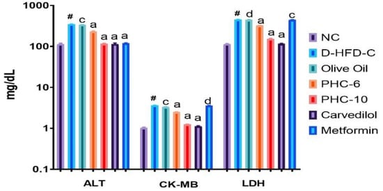 The levels of three biomarker enzymes—alanine transaminase (ALT), creatinine kinase-myoglobin (CK-MB), and lactate dehydrogenase (LDH)—in serum were assessed using UV-spectroscopic analysis following the procedures mentioned in the test kits for the respective enzymes. The results for the D-HFD-C group showed a marked rise in the blood/plasma concentration of the mentioned biomarkers when compared with the normal control group (# p < 0.0001). The controlled/decreased level of ALT in all treatment groups (PHC6 and PHC10) reflected very highly significant control over diseased conditions (Figure 4) when compared with the D-HFD-C group (a p < 0.0001). The metformin being an antidiabetic standard, the metformin-alone treatment group reflected the least significant difference (d p < 0.05) when compared with the D-HFD-C group in terms of CK-MB and LDH levels (Figure 4), showing its role only as an antidiabetic drug. However, the results for all other treatment groups, PHC6, PHC10 and carvedilol were well controlled and found to be very highly significantly different (a p < 0.0001) when compared with the D-HFD-C group.