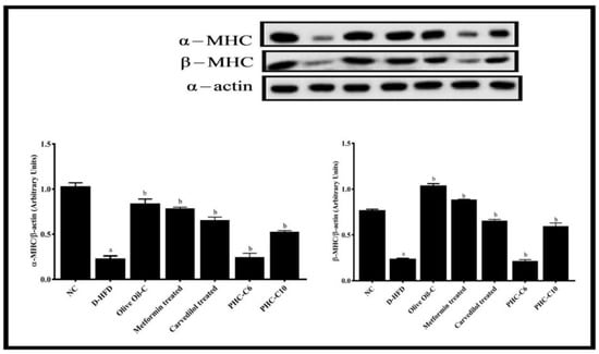 The effect of polyherbal combinations in STZ + HFD challenged rats was supported by performing Western blotting analysis, and the results suggested that the expression of α-myosin heavy chain (α-MHC) and β-myosin heavy chain (β-MHC), which are major myofibrillar proteins, was highly significantly (a p < 0.001) reduced in STZ + HFD challenged rats (D-HFD-C). Thus, STZ and HFD attenuated the level of α-MHC and β-MHC in rat heart, while the levels of α-MHC and β-MHC in the standard-treated groups (carvedilol or metformin) showed highly significant increases (a p < 0.001), the level of α-MHC in polyherbal combination treated groups (PHC6 and PHC10) showed a significant (b p < 0.05) increase, the level of β-MHC in the PHC6 group showed a significant increase (b p < 0.05), and in the PHC10 group, a very significant (p < 0.01) increase when compared to the D-HFD-C group. The increase in myosin heavy chain (MHC) expression was more significant in the PHC10 than the PHC6 polyherbal combination treated group when compared to the D-HFD-C group (b p < 0.05), as shown in Figure 7.